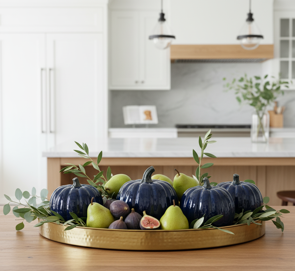 Place a low brass bowl in the center, filled with navy pumpkins, figs, and glossy pears. Add some greenery to soften things up. It looks intentional and polished, not random.