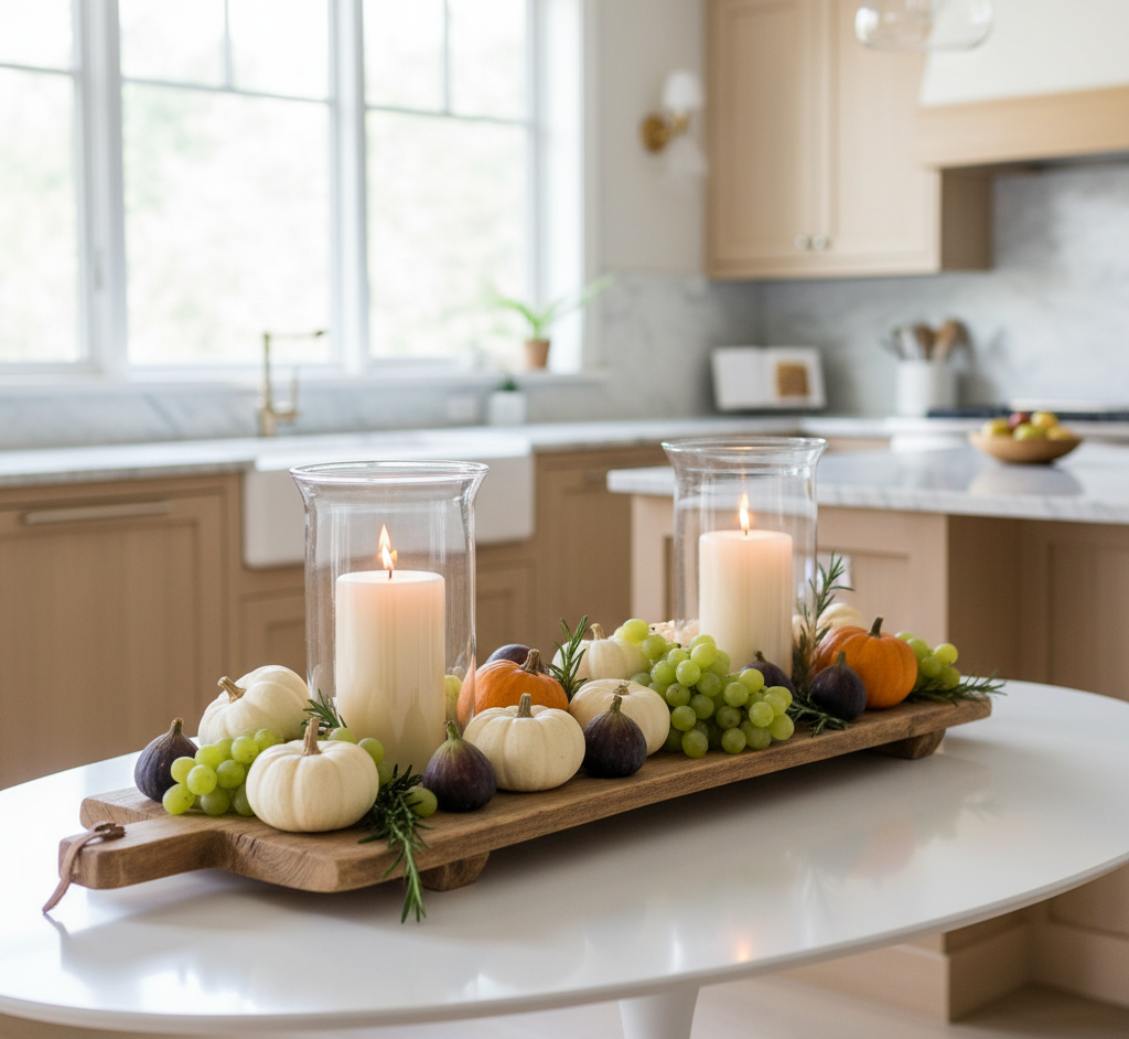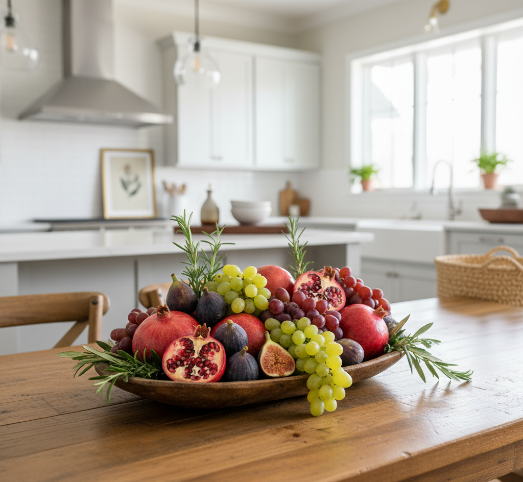 Let seasonal fruit do the heavy lifting for your centerpiece. Pomegranates, figs, and grapes bring color and texture without much fuss. Their deep tones warm up the space right away.