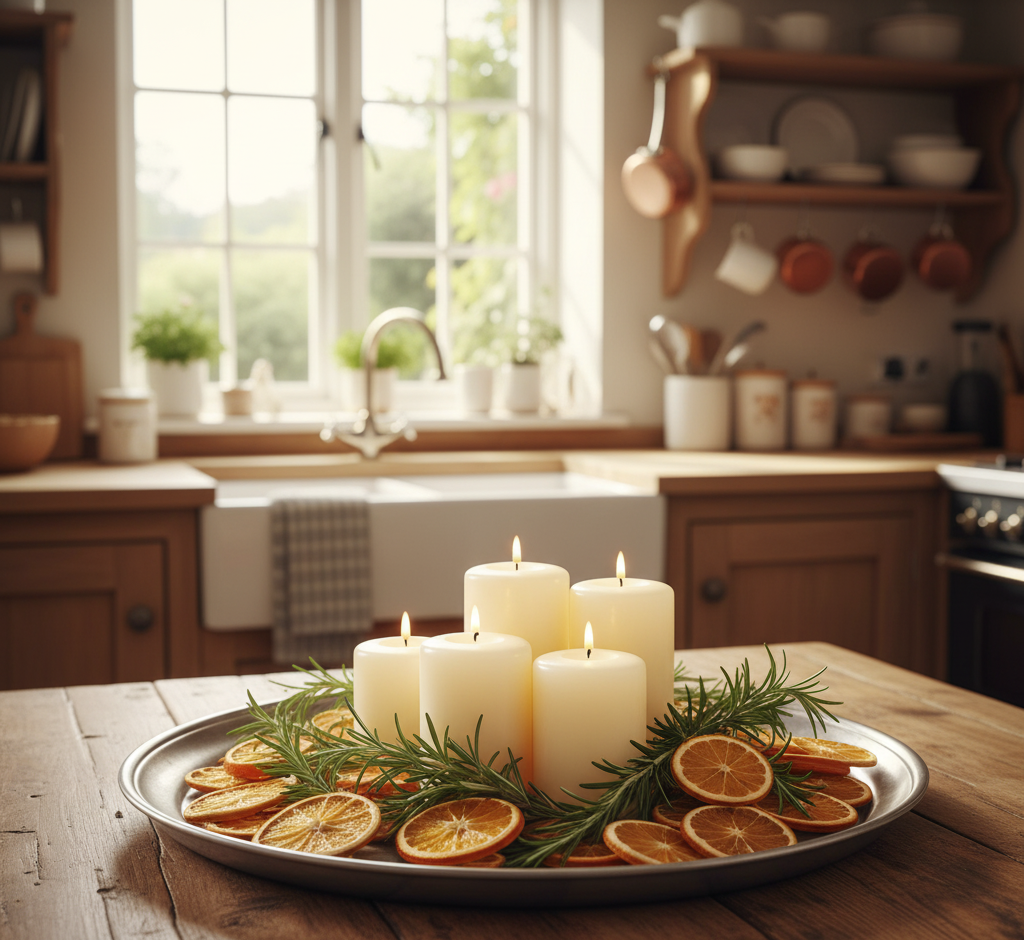 Scatter chunky pillar candles on a wooden board and tuck citrus slices between them. The natural oils add a subtle scent, and the warm light makes the colors pop.