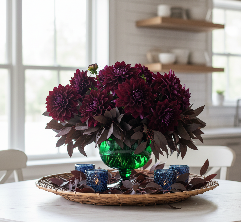 Bring in a bowl of dark grapes, a few figs, or a vase of plum dahlias. These touches add richness and keep things feeling abundant, but not over the top.