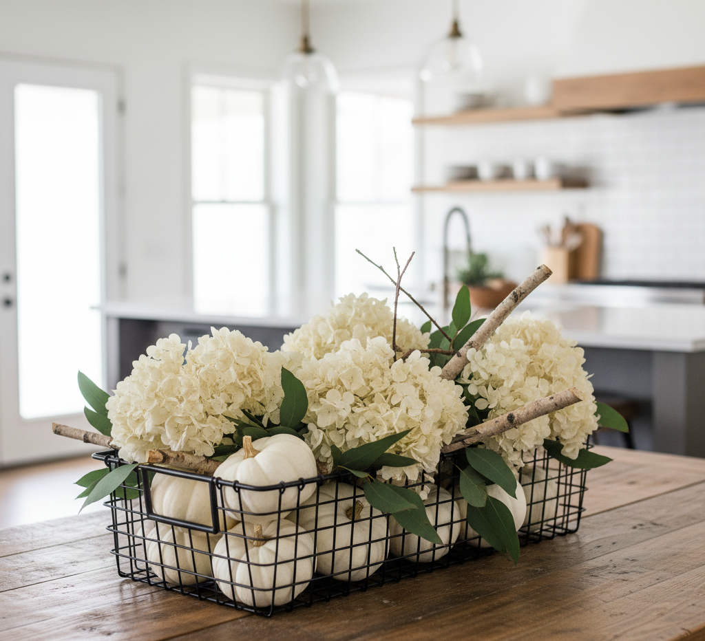 Mini white pumpkins or ivory hydrangeas bring in subtle autumn notes. Maybe toss in a cluster of birch branches in a woven basket for texture but keep the palette simple.
