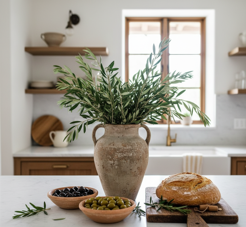 Don’t overlook smaller accents. A ceramic pitcher in earthy clay tones or a wooden board with visible grain adds warmth without needing extra decoration.
