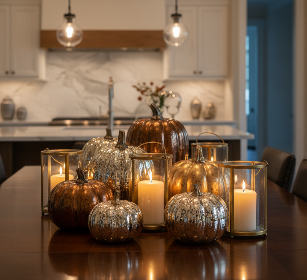 You can also work in seasonal accents without leaning on clichés. Think dried seed pods, pressed leaves under clear plates, or a cluster of velvet pumpkins in understated shades.