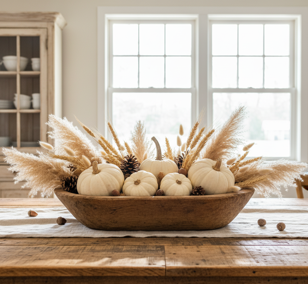 Creamy gourds, pale grasses, and natural fibers bring in warmth without shouting for attention. Try dropping a handful of ivory pumpkins, dried wheat, and pampas grass into a shallow ceramic bowl—instant autumn mood.