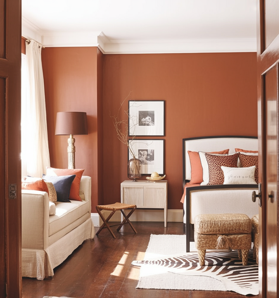 - Balance warmth: Use cream and white linens to cool down the intense wall color and create visual relief