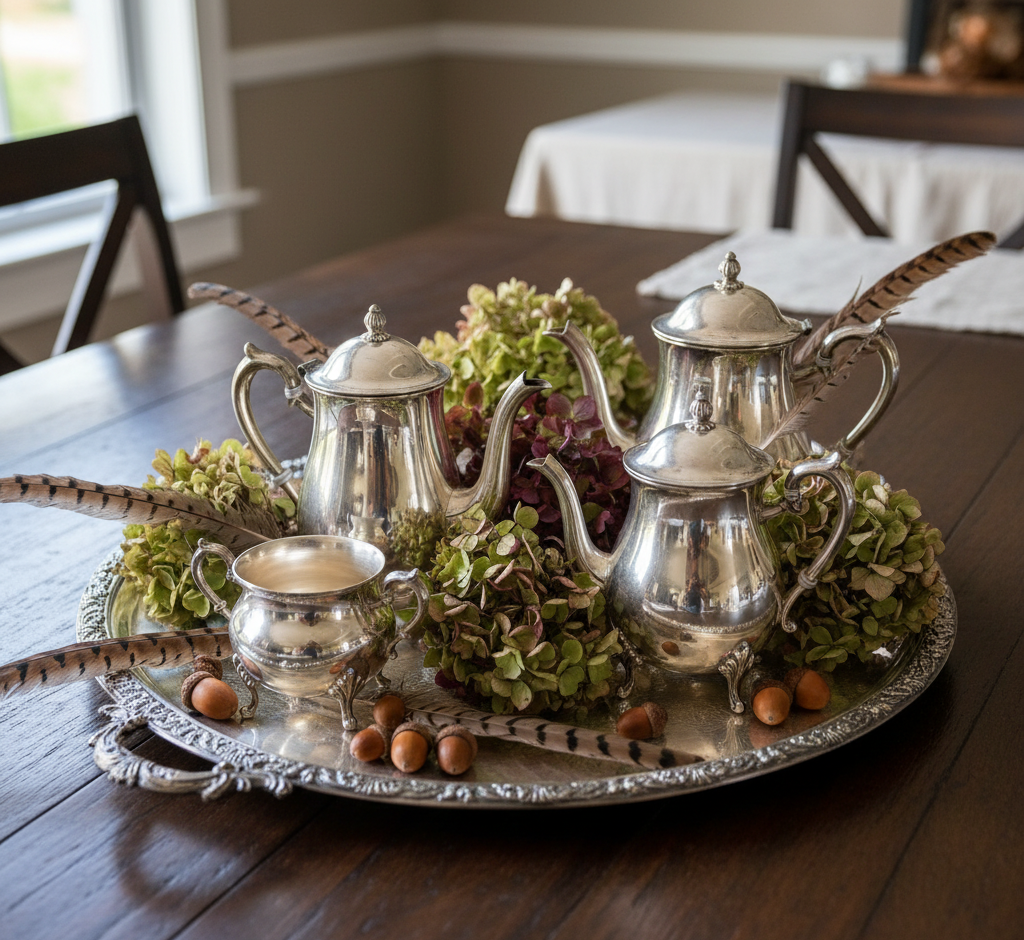 Style an antique silver tray as the base of your centerpiece. Place polished teapots, sugar bowls, or small serving pieces on top to create height and interest. The reflective silver adds brightness to the table while keeping the look classic.