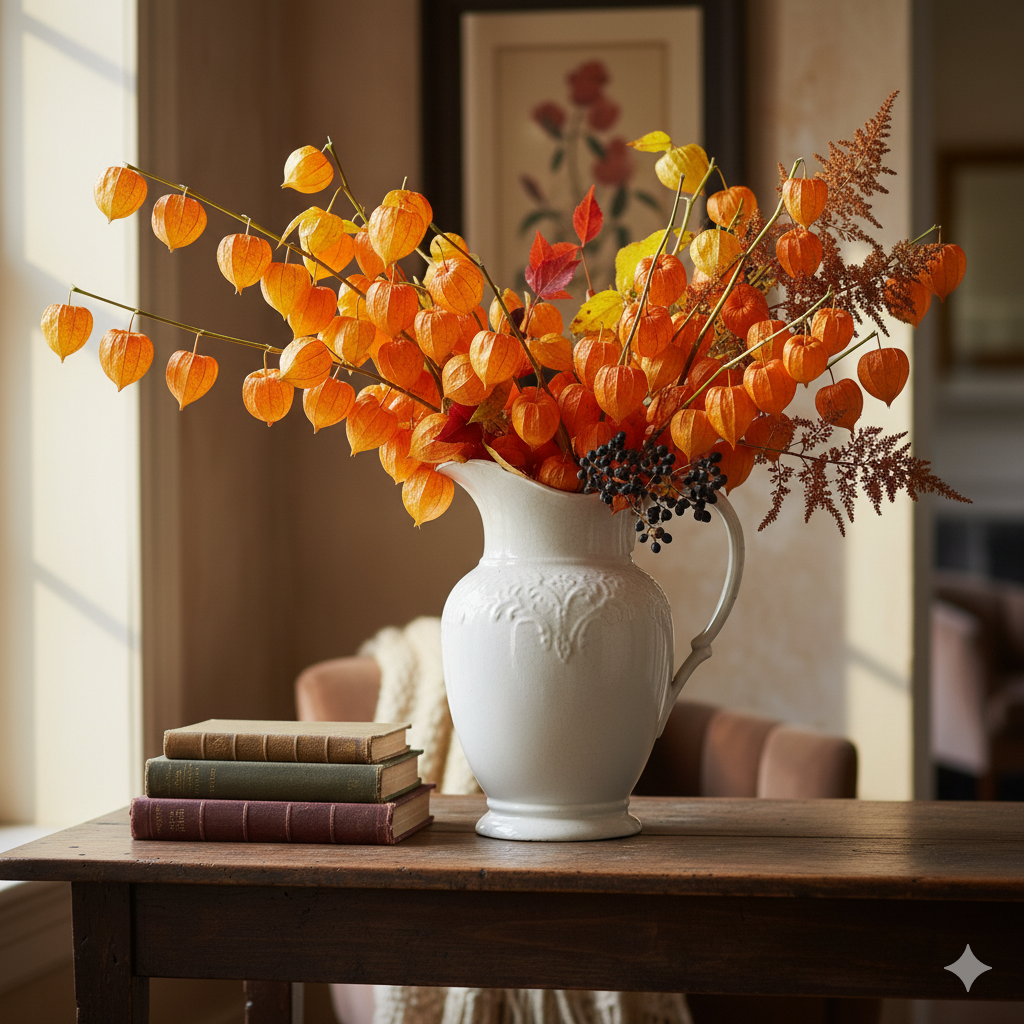 Fill the pitcher with branches of golden leaves or preserved fall stems to add height and color. Options like Chinese Lanterns or dried hydrangeas work well and keep the look natural.