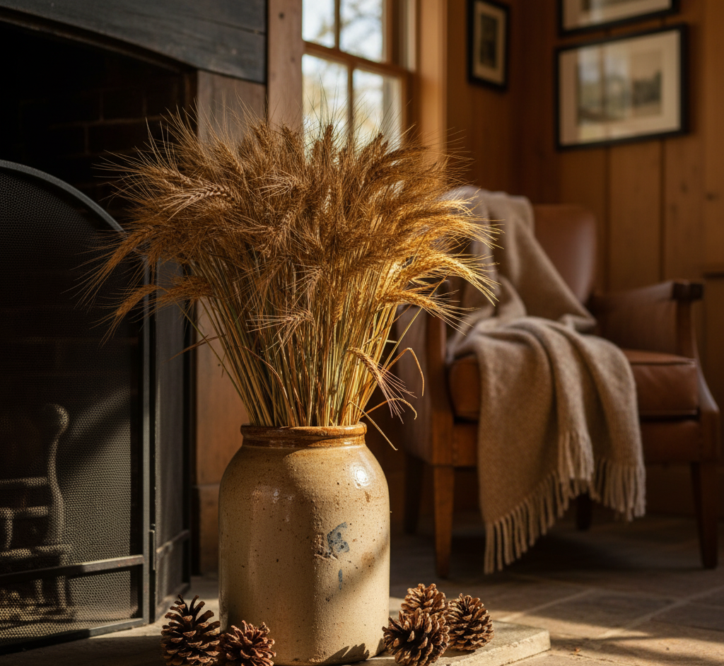 Fill a rustic antique stoneware crock with dried wheat bundles or tall cattails. Place it on the floor beside a hearth or entryway, letting its earthy presence ground the display with both history and seasonal richness.