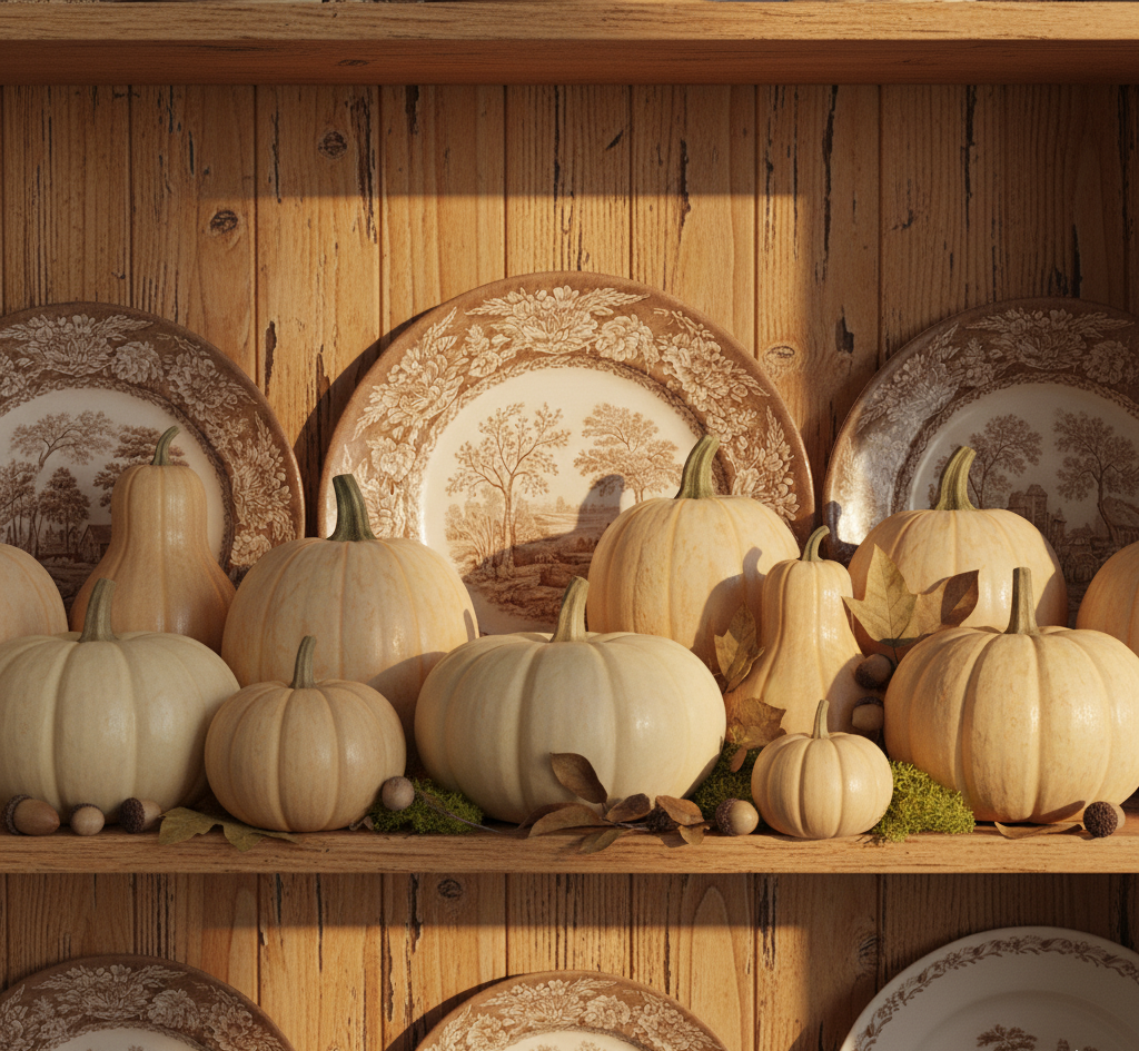Arrange a collection of vintage brown transferware plates against the wall of a hutch or shelf, then style small heirloom pumpkins in front of them. The transferware patterning should echo autumn tones, creating a layered, collected look that feels timeless.