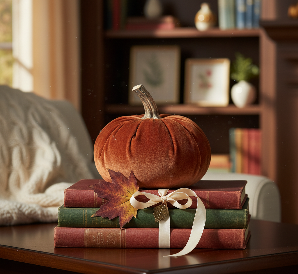 Slip a pressed autumn leaf between the pages or tie a ribbon around the stack. These small details bring in seasonal color without overwhelming the arrangement.
