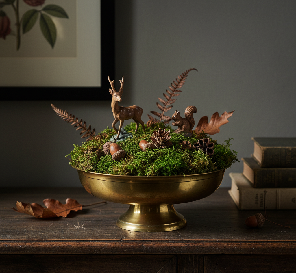 Place a small woodland figurine, such as a deer or owl, in the center of the compote. Surround it with dried seed pods or nuts to create a scene that feels grounded in nature. The scale of the figurine keeps the display playful without overwhelming the space.